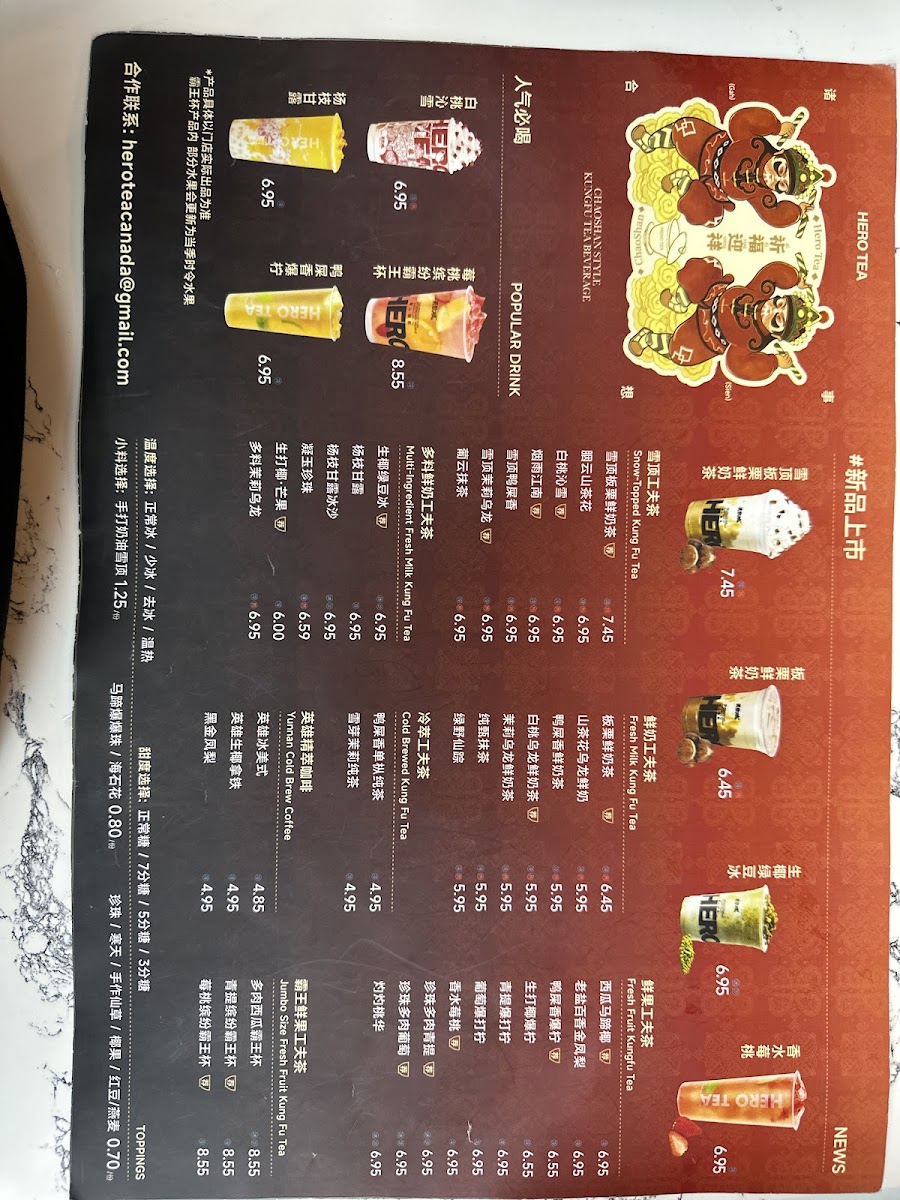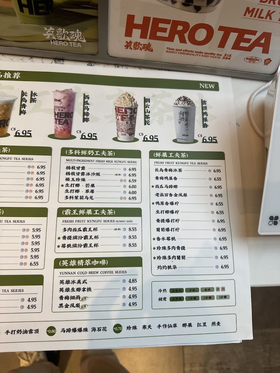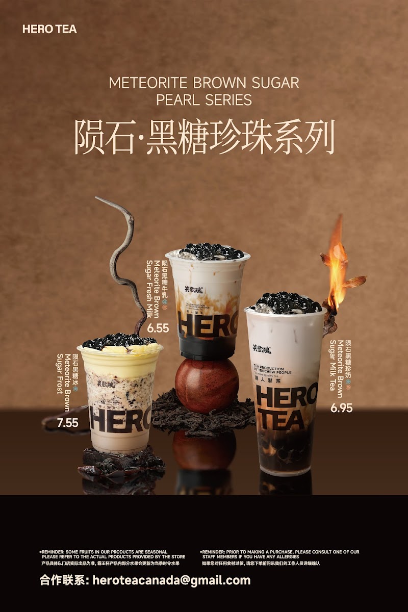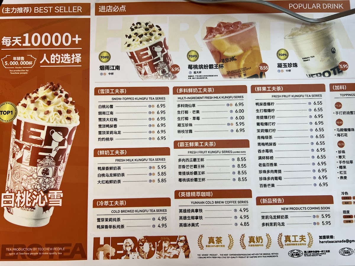 The menu at Hero Tea Mississauga centers around a variety of bubble tea beverages, featuring both traditional and innovative milk tea options. The offerings include signature fresh milk teas, such as Heros Fresh Milk Tea made with Teochew tea leaves and fresh milk, and flavored milk teas like White Peach Oolong Fresh Milk Tea. Tea selections utilize ingredients like whole leaf organic tea and white peach oolong, providing a range of natural and fragrant tea options.